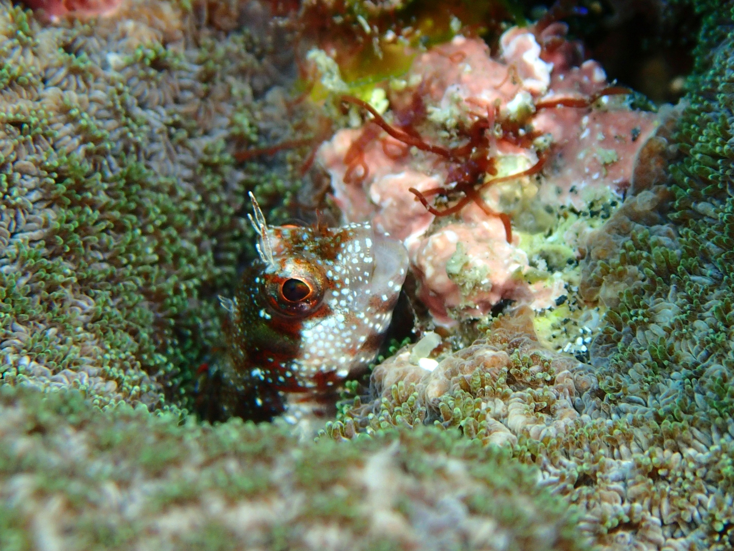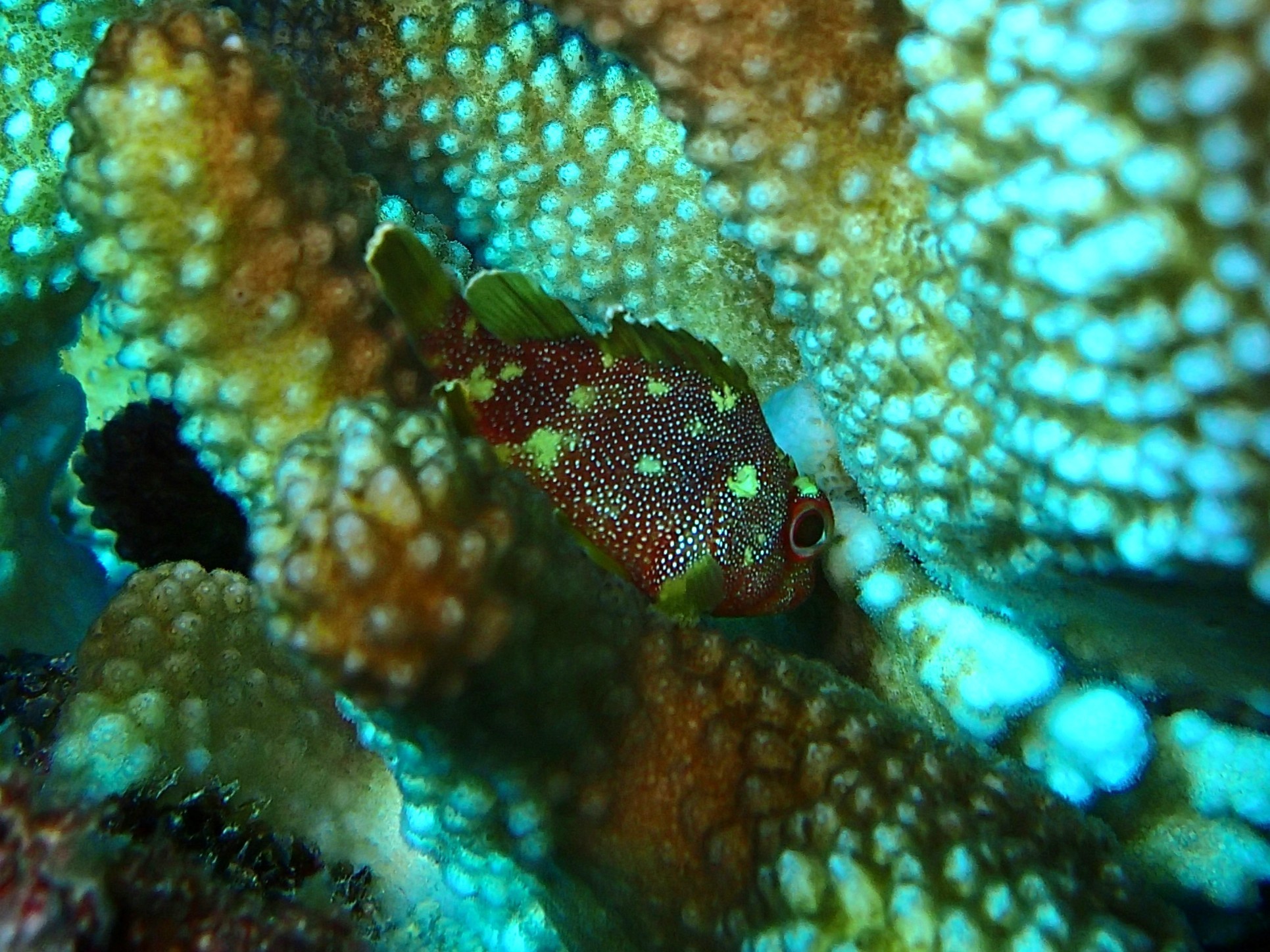 サンゴのお城に身を隠して、なかなか撮りずらいシャイな奴です