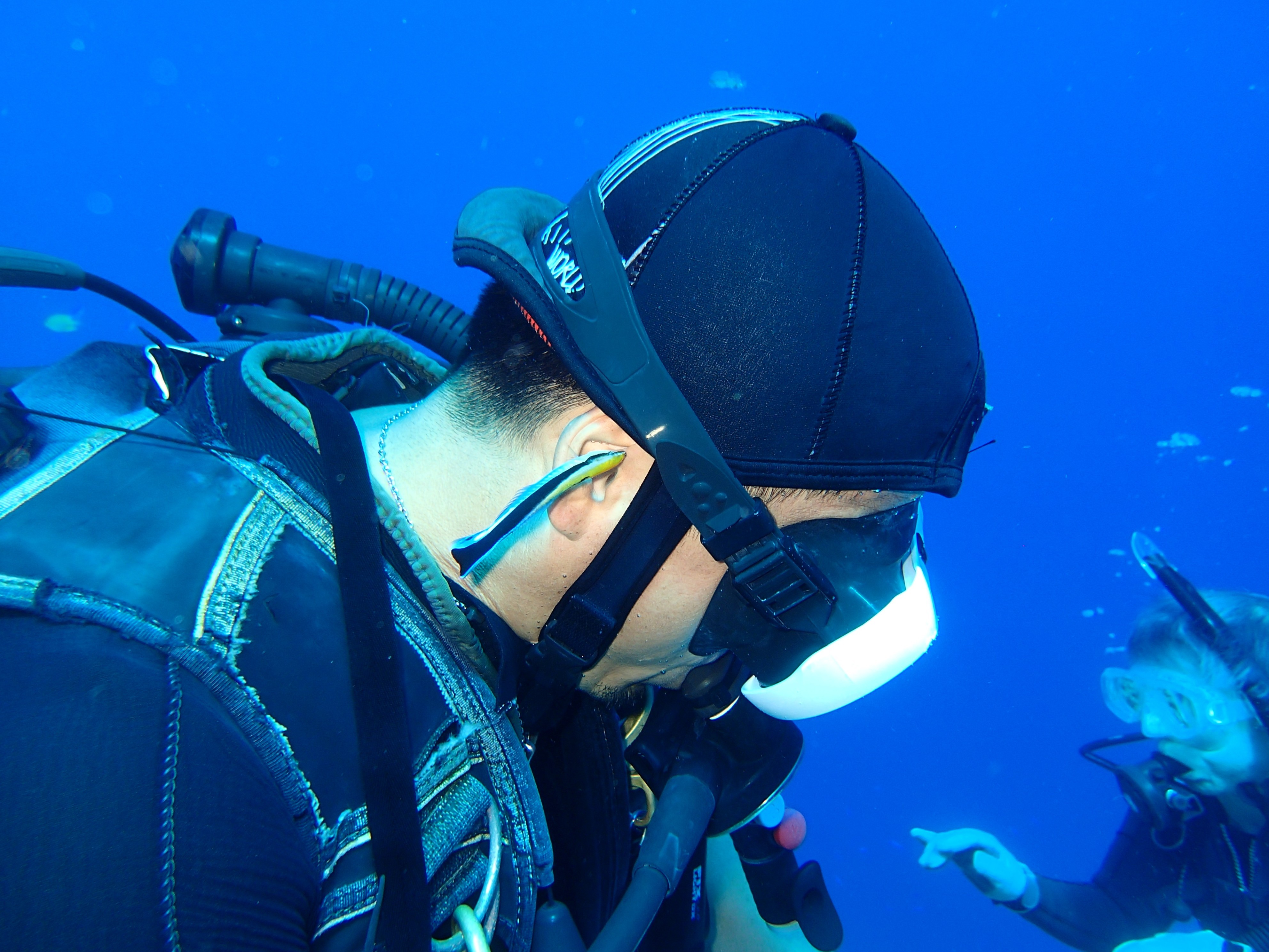 「ホンソメワケベラ」君がガイドの耳を掃除している写真です。
